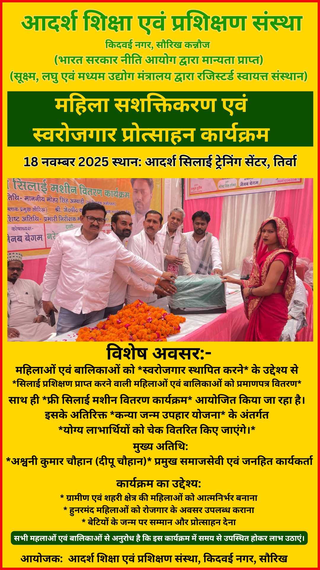आदर्श शिक्षा एवं प्रशिक्षण संस्था, किदवई नगर, सौरिख लेकर आ रही है — महिला सशक्तिकरण एवं स्वरोजगार प्रोत्साहन कार्यक्रम।