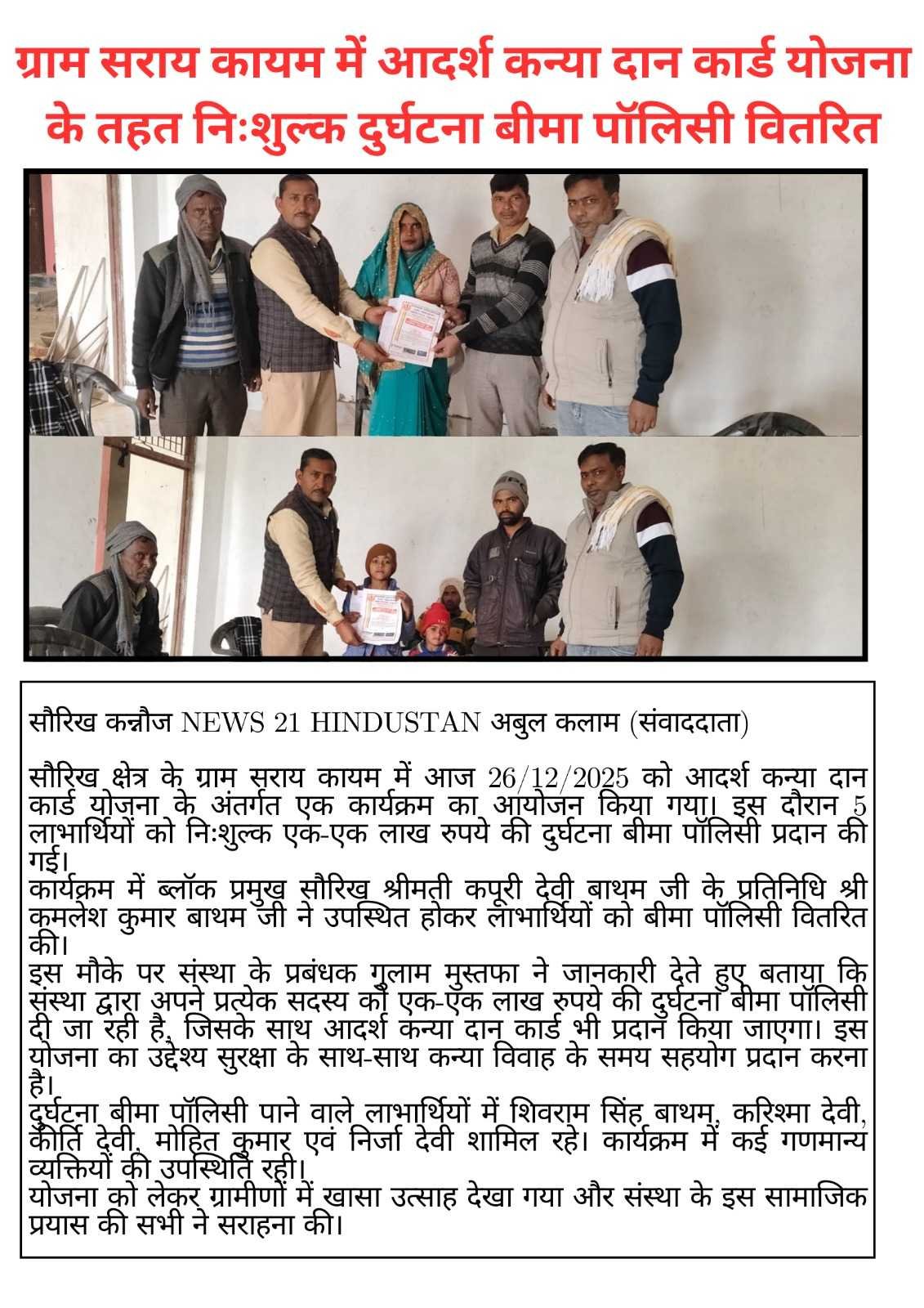 *कन्या दान कार्ड योजना के तहत आदर्श शिक्षा एवं प्रशिक्षण संस्था ने बितरित किए बीमा पॉलिसी कार्ड*