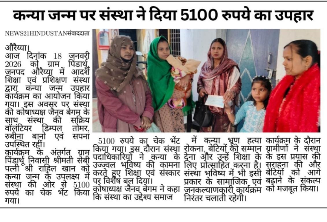 **आदर्श शिक्षा एवम् प्रशिक्षण संस्था द्वारा चलायी जा रही 'आदर्श कन्या दान कार्ड योजना' के तहत आज संस्था कार्यालय पर कन्या जन्म उपहार की चेकें वितरित की जाएंगी**